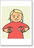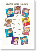 Examples of core vocabulary signs for introductions, emotions, colours and a copy of the British Fingerspelling Alphabet.