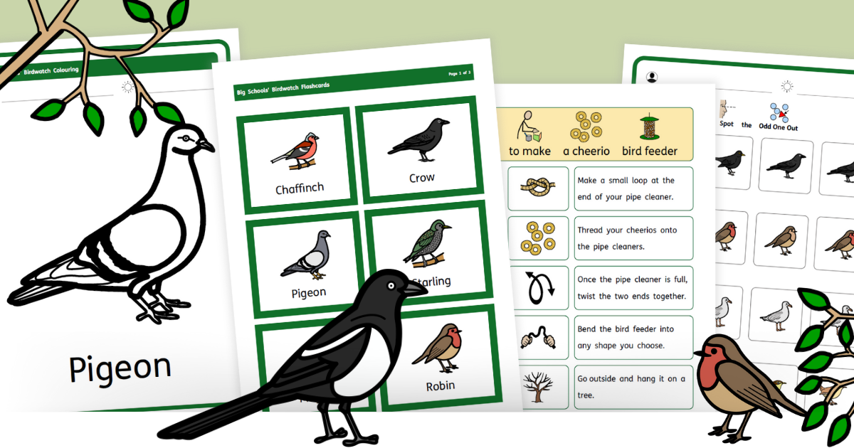 Resources can be used to support the Big Schools’ Birdwatch 2026 and include flashcards, recording activities, games, colouring, and instructions for how to make your own simple bird feeder.