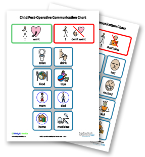 It may also be useful to assist patients for whom English is not their first language in the absence of an interpreter. A post-operative communication chart for adults is also included to assist patients in describing their symptoms and needs.